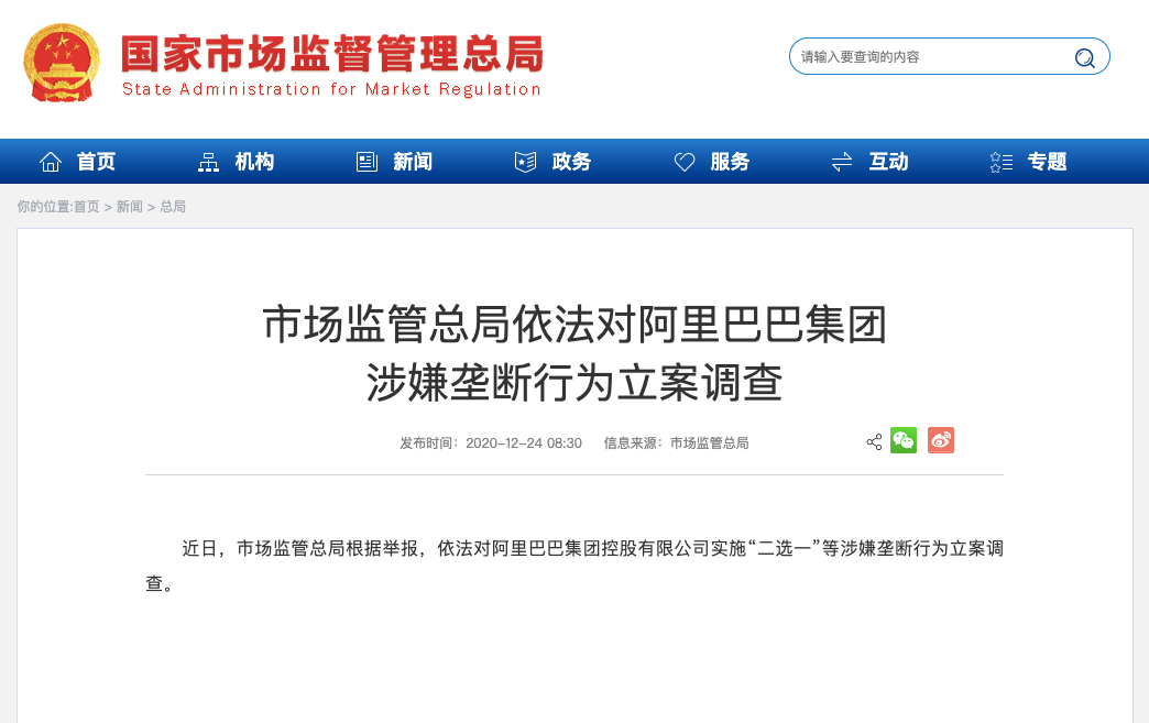 SAMR Investigates Alibaba for Alleged Monopolistic Behavior